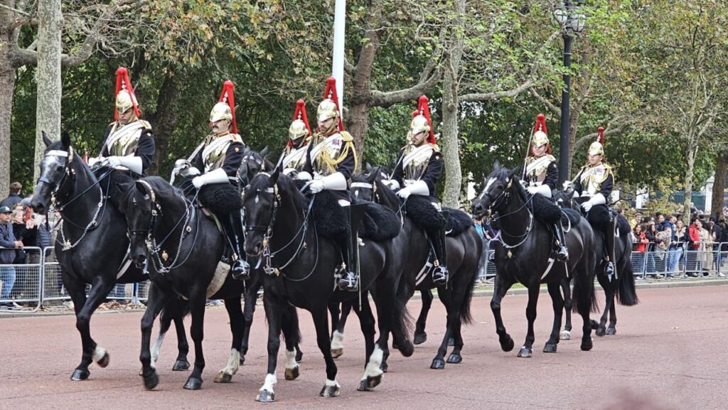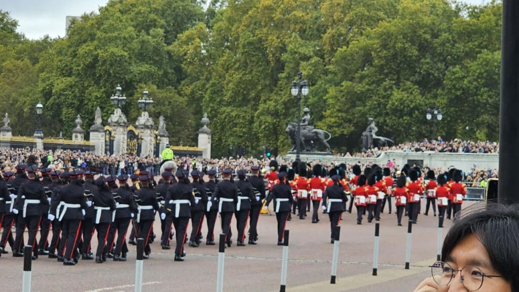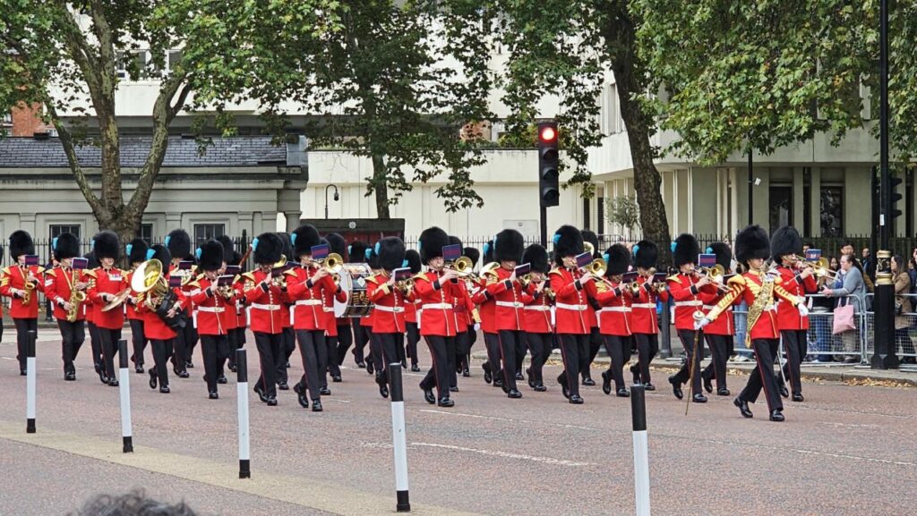 …und nehmen zurück die Fußgängerbrücke Richtung Trafalgar Square, weiter zum Buckingham Palace – und – unverhofft kommt oft – kommen zur Wachablöse vor dem Buckingham Palast zurecht. Diese hat sich zu einer inszenierten Touristenshow entwickelt. Die Wachen kommen von allen Seiten, um möglichst allen Touristen vor die Linsen zu laufen – nix mehr alte Tradition, fast schon komisch…