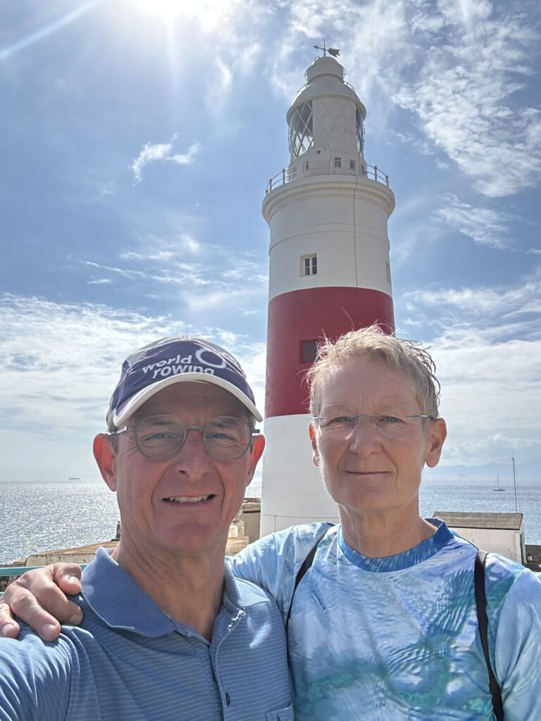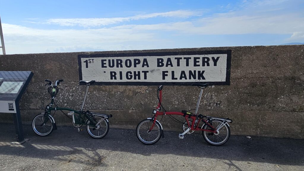 Der Wind hat auf West gedreht und meine Wehwehchens werden auch langsam besser – daher machen wir uns fertig zur Abreise aus dem Hafen von Alcaidesa. Wir besuchen nochmal den Point of Europe und den Trinity Leuchtturm an der südlichsten Spitze des Felsens von Gibraltar – unsere Bordfahrräder sind uns verlässliches Transportmittel! Vorbei an diversen Befestigungsanlagen und mehrere Tunnel durchfahrend erreichen wir den Point of Europe.