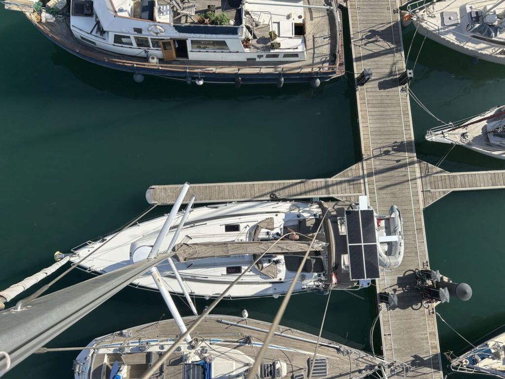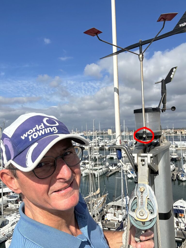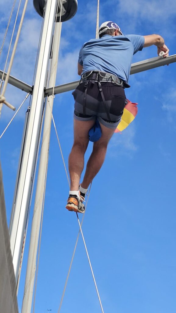 Ein paar letzte Vorbereitungen am Schiff waren auch noch zu machen – einmal kurz auf den Mast, um den mechanischen Windanzeiger festzuziehen und die verschlissenen Klebestreifen als Scheuerschutz an den Salingen neu anzubringen…