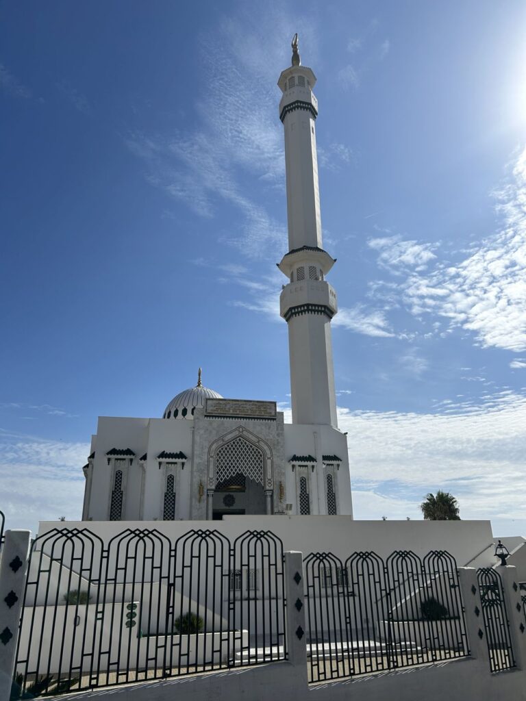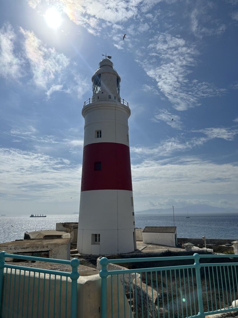 Leider wurde dieser ikonische Punkt durch einen Stadionbau etwas verunstaltet – woanders war wohl kein Platz dafür vorhanden! Wir blenden das Stadion aus und fokussieren auf den schönen Leuchtturm und auf den Blick nach Süden über die Straße von Gibraltar, im Hintergrund das Rif-Gebirge in Marokko.